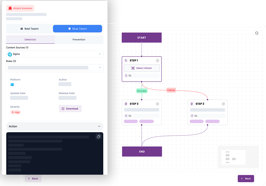 Select a prebuilt threat scenario from the library or create your own custom threat. Review the attack steps and techniques that will be executed during the simulation.